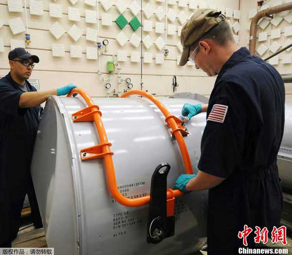 கலைக்கப்படும் முன் B53 அணுகுண்டைப் பணியாளர்கள் பரிசோதித்துக் கொண்டிருக்கின்றனர்.
