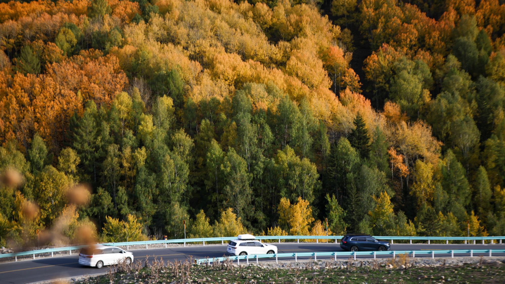 இலையுதிர்க்காலத்தில் சின்ஜியாங்கிலுள்ள அஹே நெடுஞ்சாலையின் பொன்னிறக் காட்சிகள்