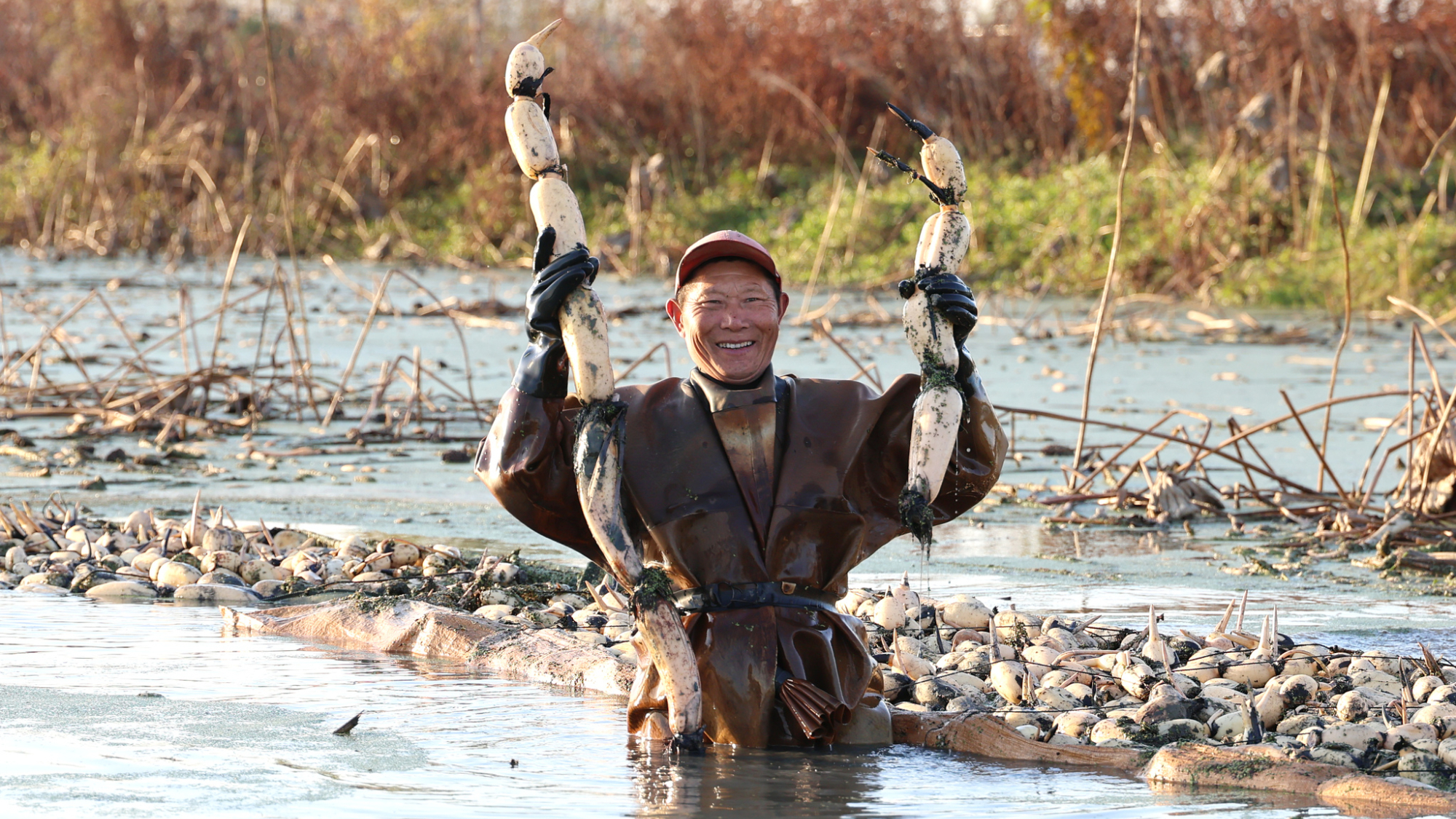 ஜியாங்சு மாகாணத்தில் தாமரைத் தண்டுகள் அறுவடை